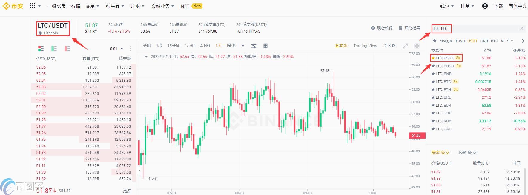 7.在右侧搜索框搜索币种简称LTC,选择LTC/USDT交易对