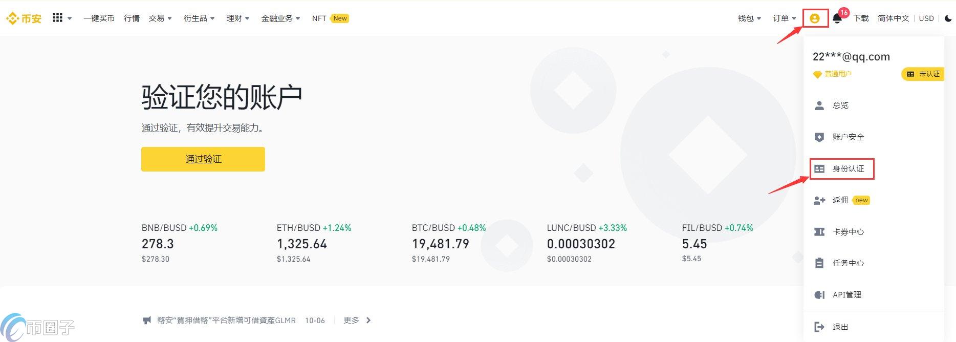 4.登录币安账户,在首页【用户中心】--【身份认证】进行身份认证,在该页面可以查看当前认证级别,它决定了您的账户在币安的交易限额。如需提升额度,请依次完成各个级别的身份认证。