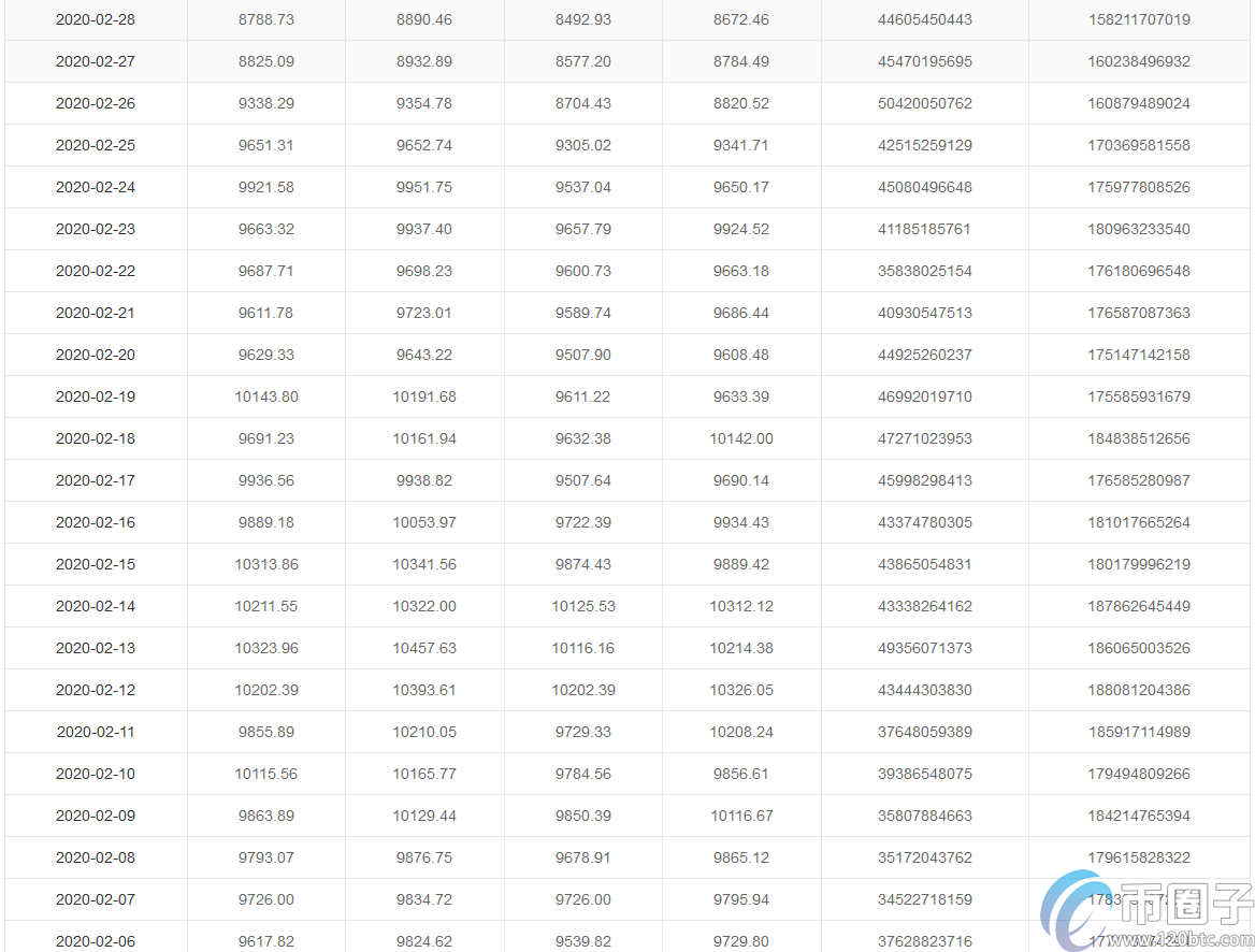 2020年2月比特币价格最低价格62067元,最高价格73897元
