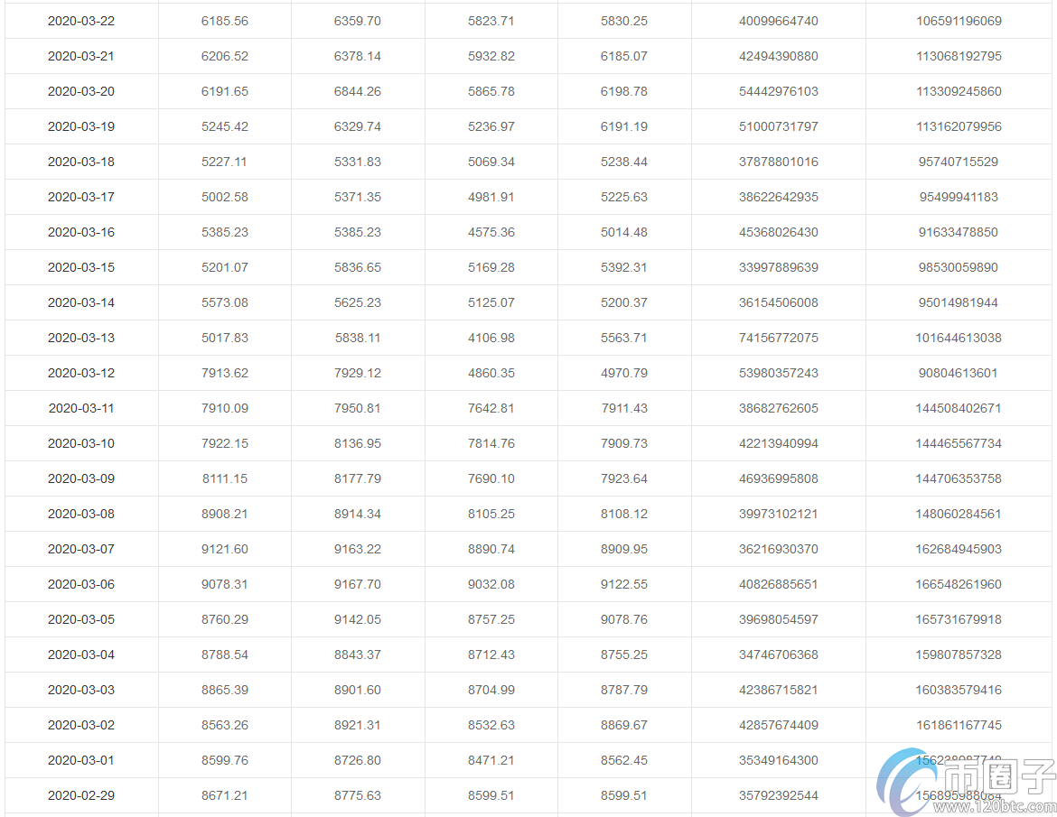 2020年3月比特币价格最低价格35807元,最高价格65291元