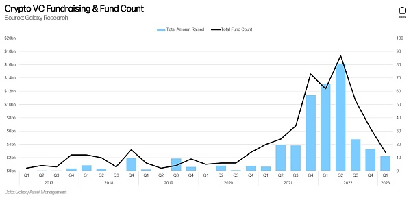 我们与 Galaxy Asset Management 合作编制了 2023 年第一季度的 VC 筹资信息——即 VC 为新基金筹集的资金。2023 年第一季度是自 2020 年底和 2021 年初以来推出的最少数量新基金(14 个)和筹集的最低资金(22.3 亿美元)。