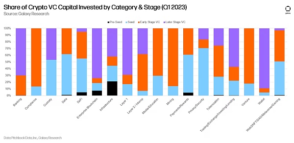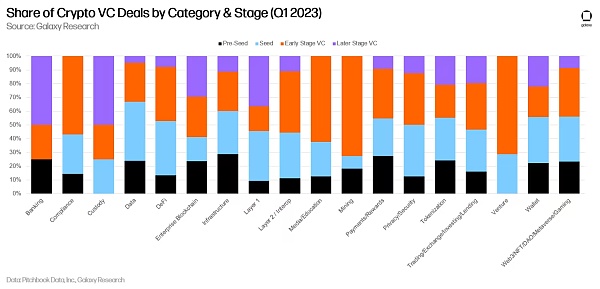 当在 2023 年第一季度按融资阶段评估时,VC 的活动看起来更加清晰(种子前、种子、早期、后期)。在后期阶段公司完成的融资中,“挖矿”类别占比最大,而包括节点托管和质押服务在内的“基础设施”类别在早期阶段公司完成的融资中占比最大。