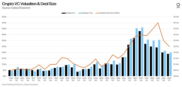 VC 投资规模中位数从 2022 年第三季度的历史高点(450 万美元)继续下降(250 万美元),而加密初创公司融资前估值中位数为 1880 万美元,为 2022 年第一季度以来的最低点。