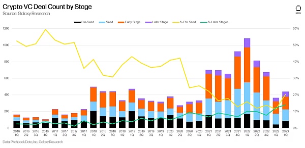 种子前投资正在增加。在经历了 2022 年惨淡的第四季度之后,种子前投资的数量在相对和绝对基础上都在上升。在 2023 年第一季度完成的所有加密 VC 投资中,有 20% 流向了处于早期阶段的公司,这表明创始人很活跃,VC 也很关注。由于许多人在熊市期间完全退出了加密行业,精明的 VC 可能会像在之前的熊市期间那样在充满挑战的环境中找到顽强的初创公司。