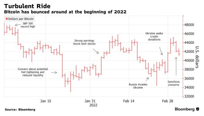 获悉,在市场预期制裁或推动俄罗斯资金流向加密货币的影响下,比特币本周早些时候一度站上45000美元,然而,在这一预期似乎被证伪,同时有报道传出乌克兰核电站被攻击后,比特币重新回落至41000美元附近。