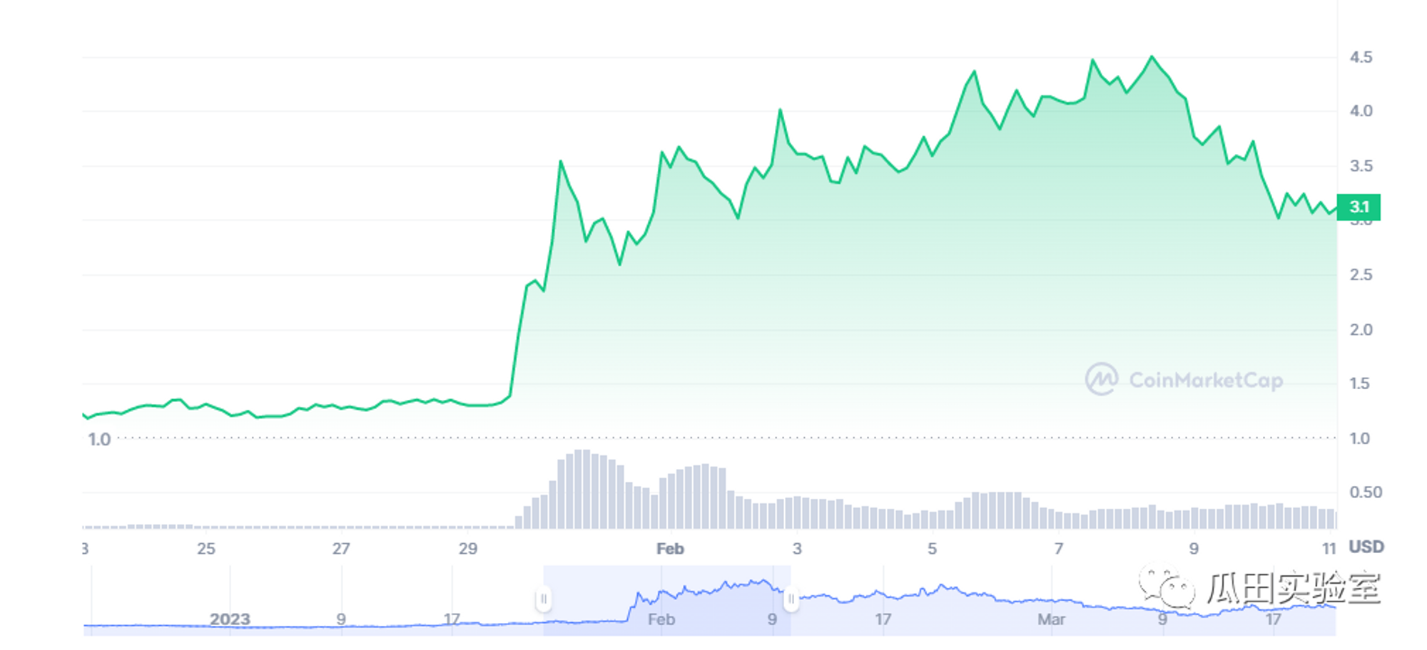 1 月 30 日 CZ 喊单的当天,HIGH 代币就从 1.3 美元直直的拉升到了 3.6 美元附近,接近 3 倍的涨幅;第二天热度降温,代币降到 2.6 美元,谁知又来一个王炸,周杰伦正式与 Highstreet 签约,又是硬生生的把下跌通道的代币拉回到了 3.6 美元附近。在随后的一周时间里,代币价格一直在 3-4 美元直接徘徊,最高触及 4.5 美元左右。