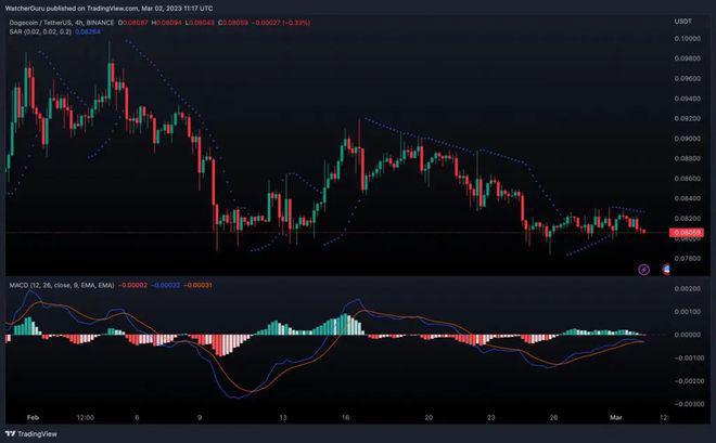 狗狗币的短期价格图表显示看跌观点。抛物线转向指标在烛台上形成虚线,进一步限制了任何向上运动。MACD 指标在整个上周和本周初都看涨。然而,信号线正慢慢试图压倒 MACD 线。由此,狗狗币进入看跌领域。