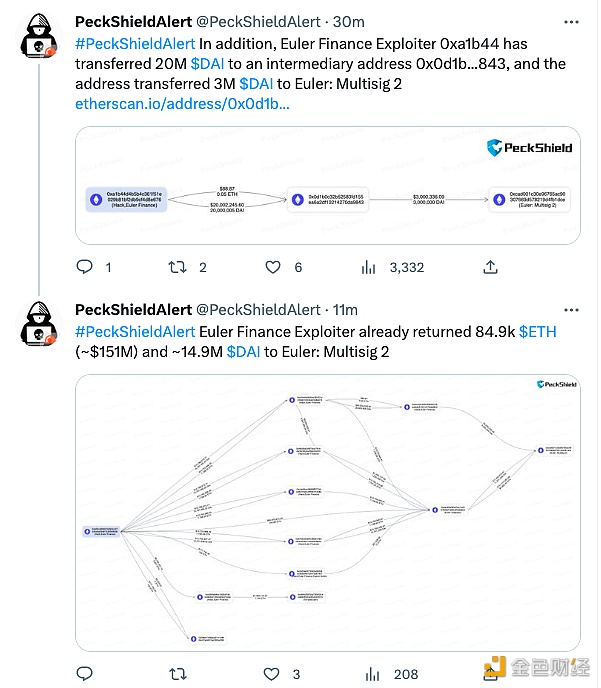 据PeckShield监测,除今日早些时候Euler Finance攻击者通过 0x8765开头和0xa1b4开头的地址今日向Euler部署者账户返还了15476.1枚ETH和1070万枚Dai外,该攻击者还通过0xc4e04的地址向Euler部署者账户返还了7738.05枚ETH。即黑客今日共计返还了23214.15枚ETH和1070万枚Dai,约合4100万美元。此外,0xa1b44已将2000万枚DAI转移到一个中间地址0x0d1b...843,该地址将300万枚DAI转移到Euler:Multisig 2地址。 截止目前,Euler Finance 攻击者已经向 Euler 返还了8.49万枚 ETH(约 1.51 亿美元)和约 1490 万枚DAI。