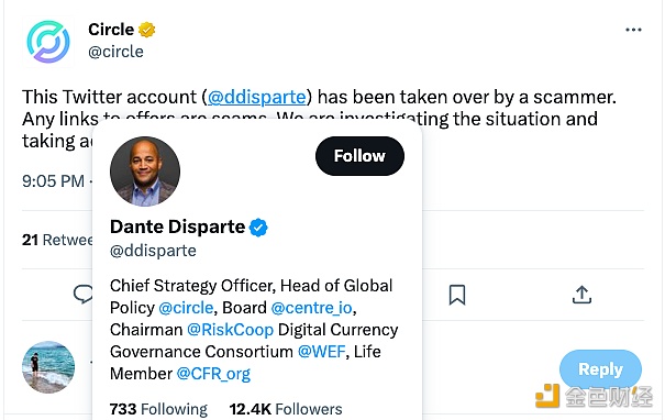 Circle在社交媒体上称,Circle首席战略官Twitter账户(@ddisparte)已被一个诈骗者接管。任何报价链接都是骗局。我们正在调查这一情况并采取相应行动。 此前,Circle首席战略官在推特中称,向USDC持有者推出忠诚度奖励分配计划。不过目前该推文已删除。