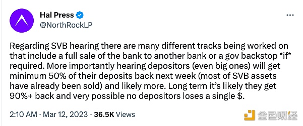 Hal Prss:下周在SVB听证会上储户将获得至少50%的存款 更新时间:2024-11-28 20:45:38 •阅读 0 对冲基金North Rock Digital CEO Hal Press发推称,关于SVB的听证会,有许多不同的渠道正在进行,包括将银行完全出售给另一家银行或政府的支持,如果需要的话。更重要的是,下周听证会上储户(甚至是大储户)将获得至少50%的存款(SVB的大部分资产已经被出售),甚至可能更多。长期来看,他们可能会得到90%以上的回报,而且很可能没有储户损失一分钱。