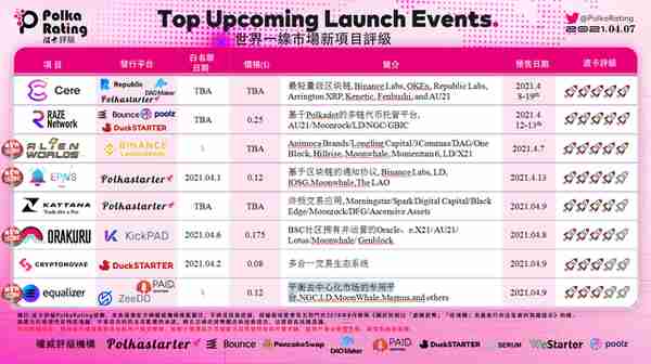 下面是即将来临的8大项目,这些都是PolkaRating从众多项目中筛选出来的有前途有价值的区块链项目,这些项目包含了已经开始白名单注册登记的代币或预计将很快推出的代币。内容包括发行平台,白名单登记日期,预售价格,项目简介,投资商,发行日期,以及我们PolkaRating对该项目的评价。各个项目具体的内容请大家参考项目官网自行判断投资。