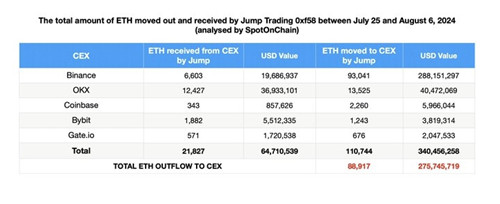 7月25日至8月6日期间,Jump Trading向各大交易所存入价值约2.76亿美元的ETH(8.89万枚),8月5日,ETH的价格暴跌20%。目前,Jump Trading还持有2.9万枚stETH和2.46万枚ETH。
