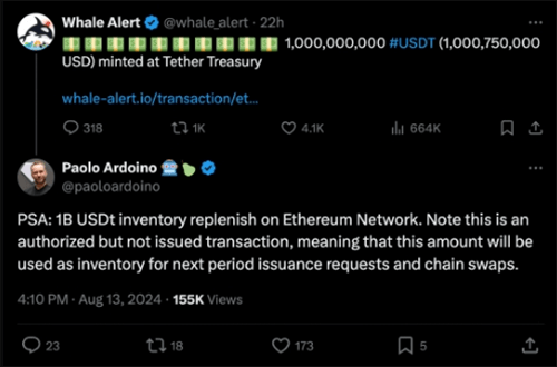 此次USDT余额的激增紧随Tether财政部在以太坊网络上增发10亿美元USDT之后。据数据追踪平台Whale Alert于8月13日披露,Tether在以太坊区块链上新增了这笔巨额稳定币。然而,Tether首席执行官Paolo Ardoino随即澄清,这批新增的USDT属于“已授权但未发行”的库存补充,旨在为未来可能的发行请求和跨链交换预留资金,以确保流动性管理的顺畅进行,而非立即释放至市场流通。