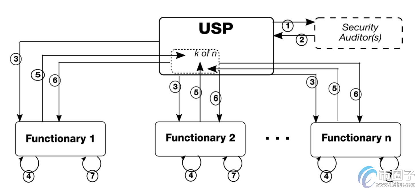 6)每个工作者会在自己的服务器接受到上游软件提供商(USP)以及绝大多数工作者的签名;