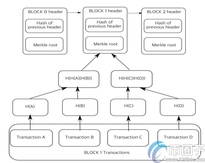 (图1:默克尔树(Merkle tree),负责将区块交易连接到区块头默克尔根)