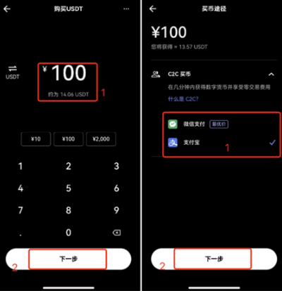 2.在选择好数字货币种类后,进入下一个页面,输入你打算购买的金额,然后点击【下一步】。这时,系统会提示你选择支付方式,以便完成购买。