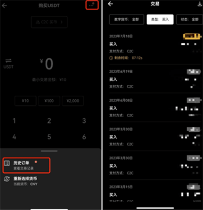 6.如果你想查看自己的购买记录,只需在购买数字资产的页面上,点击右上角的更多图标,然后选择【历史订单】。在这里,你可以方便地查看所有的买入、卖出等历史交易记录。