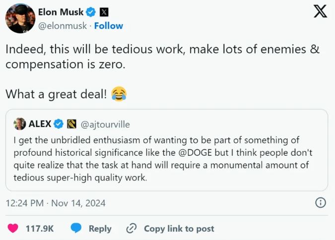 事实上,这源自于马斯克在政治上的一个倡议,即成立一个名为「政治效率部」(Department of Government Efficiency),简称 D.O.G.E,这个计划是他与前总统唐纳德·特 朗普共同发起的一项倡议,旨在对联邦 政府进行全面的财务审计,并提出减少浪费、欺诈和不必要支出的建议。特 朗普在纽约的一次演讲中公布了该计划,这是基于马斯克在 X 上提出的建议。马斯克表示,他愿意参与这一计划,并且不会索取任何报酬或头衔,强调他希望简化政府运作的决心。