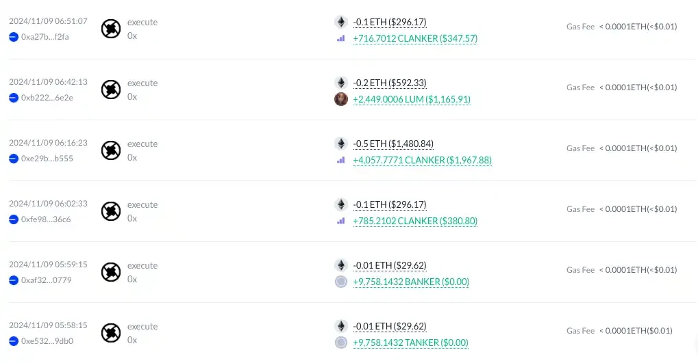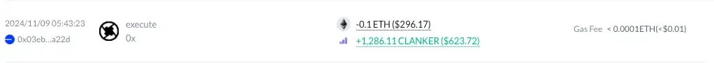 11 月 9 日,mopzy.eth 买入了价值 0.1 ETH 的 CLANKER,彼时距离其开盘不到两小时。