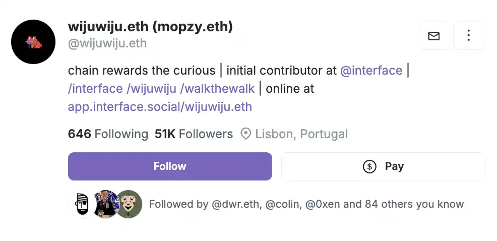 而在 Warpcast 上搜索 mopzy.eth,出来的是 interface 早期贡献者 wijuwiju.eth。