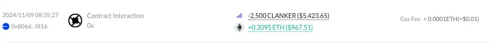 三小时后,mopzy.eth 卖出了 2500 枚 CLANKER。