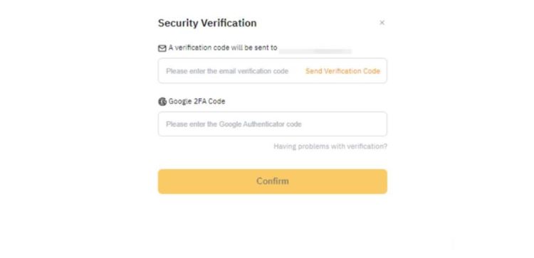 6、输入您的电子邮箱地址和谷歌双重身份认证码,然后点击确认。点击发送验证码,以接收邮箱验证码。如果在完成电子邮箱验证时遇到任何问题,请参阅此故障排除指南。