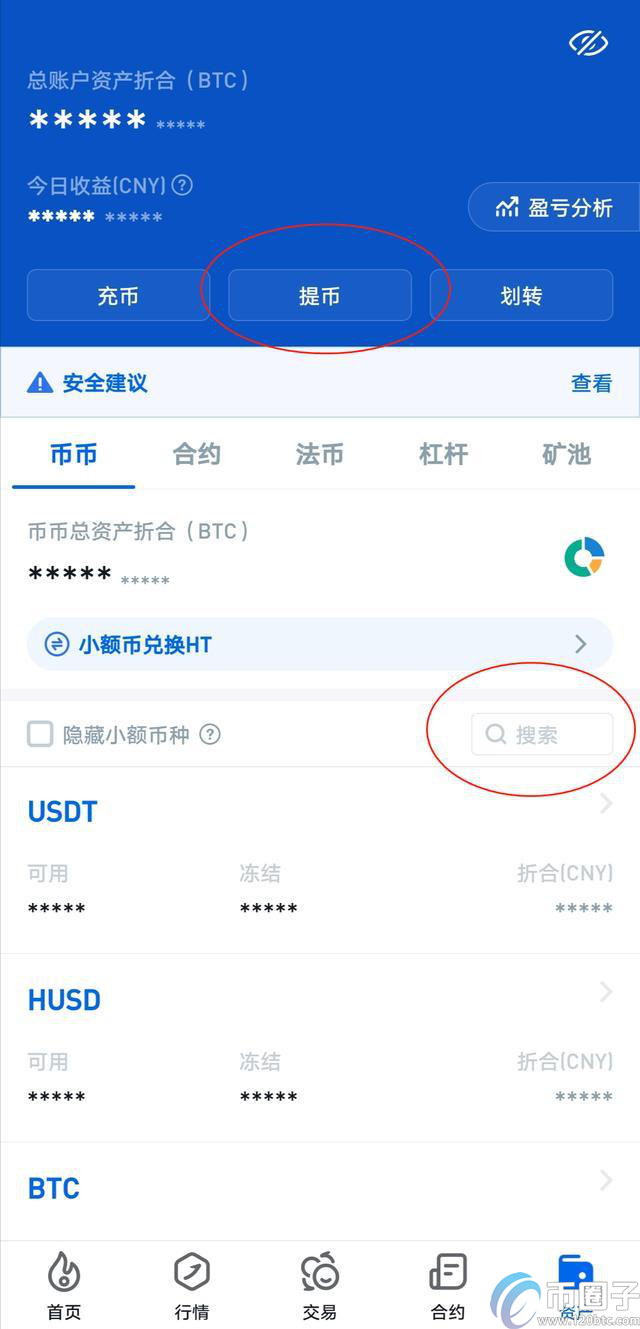 1、打开火币APP【火币PRO】,点击【资产】,在资产界面点击中上方的【提币】,或者直接在搜索框中搜索想要充值的币种。