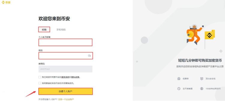一、打开币安官网,选择【使用手机或邮箱注册】即可进行注册。