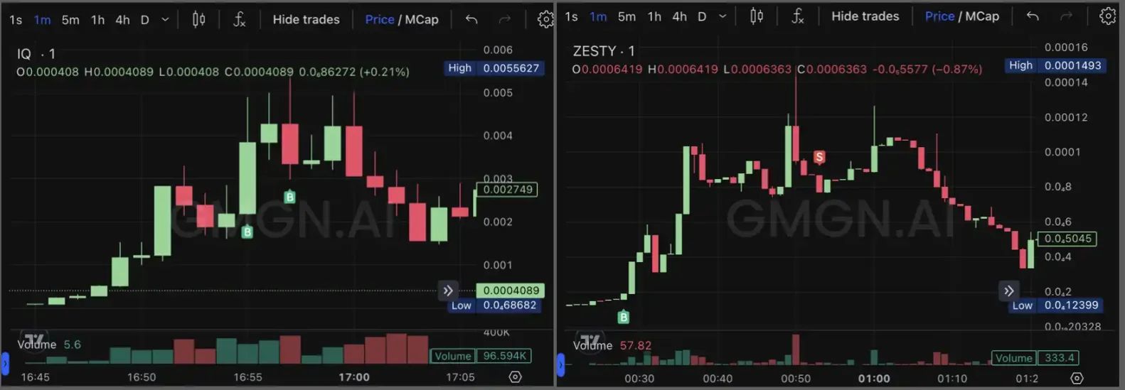 meme 币 IQ(左)、ZESTY (右)的分线