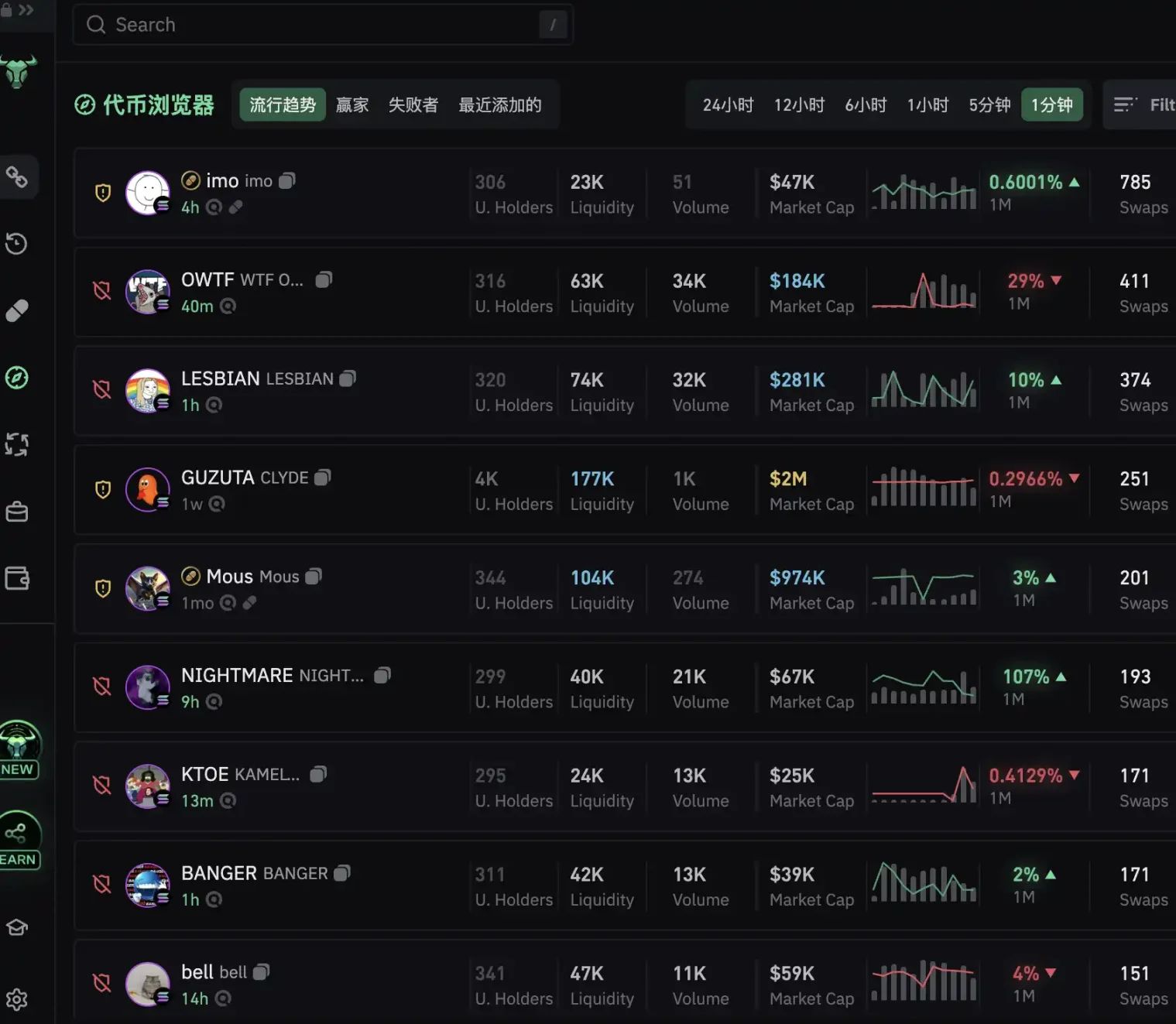 查看代币走势只是这些工具最基本的功能。冲 meme 的准备工作可以分为「从币找人」和「从人找币」,在这个需求上,有的工具适合做看板、分析筹 码分布,有的工具在提示地址异动上更加灵敏,还有的在交易速度上表现更佳。