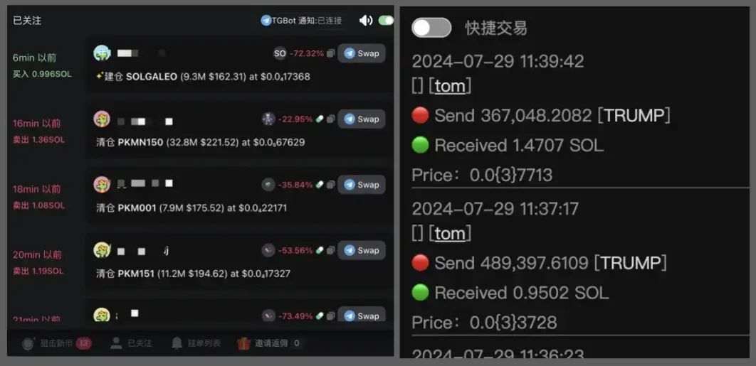 GMGN 和 NFT Sniper 在查看相关利益方筹 码分布上有突出优势。GMGN 相对新手友好一些,可以查看包括 dev、前排买入者、持仓大户、聪明钱、KOL 等指标,还可以创建关注钱包 list。而在「从人找币」这个环节,GMGN 和 NFT Sniper 也都有提供链上异动提醒功能,用户把想要监控的链上地址加进关注列表,这些地址产生交易行为时,用户就能在网页端或手机端 tgbot 上收到提示,第一时间获得信息。