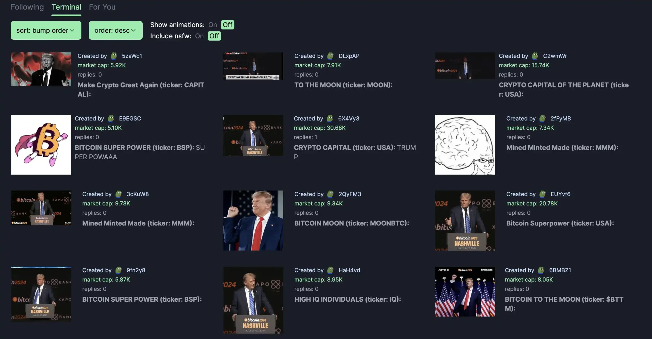 「注意力是最重要的,特 朗普出新闻肯定都有跑出来的币。」陆奇自那之后产生了这样的判断。前几日,特朗 普作为第一个美国前总统在纳什维尔在比特币 2024 大会上作演讲期间,meme 玩家从从推迟出席到全程蹲守到做完演讲,在 Pump.fun 上实时蹦出各种关键词代币中寻找下 注标的。而在几十个相关 meme 币中,没有一个市值超过 500K。