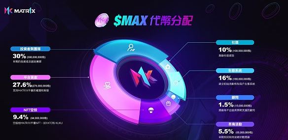 7月10日,MATR1X 官方公布其平台治理代币 MAX 的代币经济学。MAX 的总供应量为 10 亿枚,将空投 9400 万枚 MAX 给 MATR1X 平台 NFT 的持有者,如 YATC 和 MATR1X KUKU NFT 的持有者。