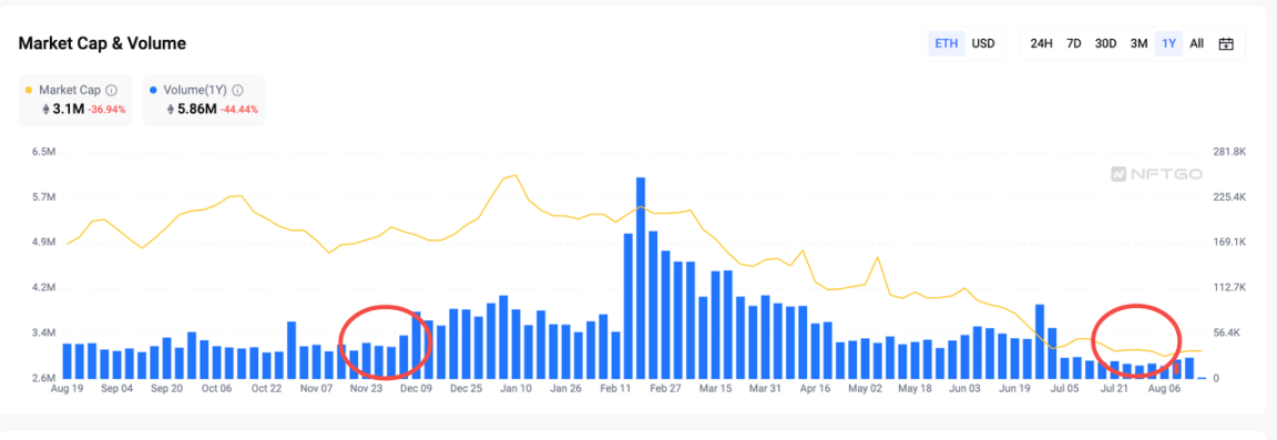 和加密市场一样,NFT 也有自身的轮动周期,而在 2022 年的 11 月份,NFT 市场的交易量也经历了一次低谷,日交易量约为 5kETH 左右。在这两次小熊市周期里,在经历了大半年的变化下,那些头部的 NFT 表现如何?有哪些 NFT 下跌?又有哪些 NFT 逆盘上涨?