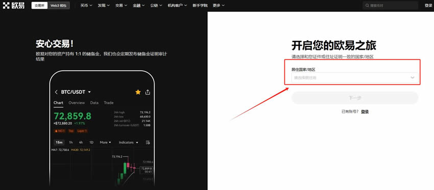 打开欧意(OKX)交易所官网,在首页输入邮箱,点击“注册”。选择居住国家/地区,勾选服务条款、《风险与合规披露》及隐私政策与声明。完成滑块验证,输入邮箱收到的验证码。输入手机号,点击“立即验证”,并输入手机收到的六位数字验证码。创建密码,密码需要符合长度为8-32个字符、包含1个小写字母、1个大写字母、1个数字和1个符号等条件。
