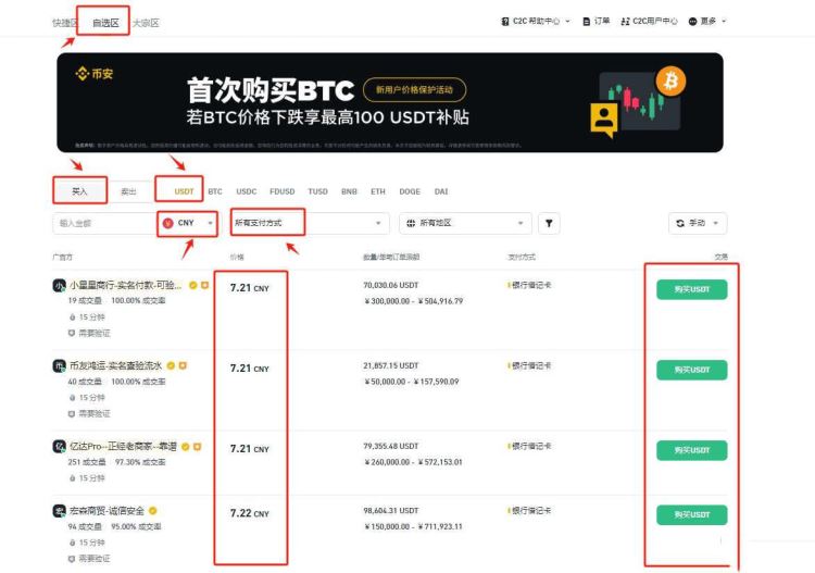 6、在进行现货交易前需要获得USDT,可在“一键买币”——“自选区”——“买入”获得,注意法币需要选择CNY,然后根据需求选择交易商家