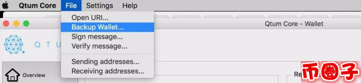 选择File, Backup Wallet, 将一个dat格式的文件导出,此钱包文件配合钱包密码可以恢复钱包,务必备份保存好。