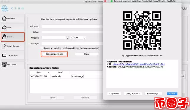 点击Receive, Request payment, 会生成新的地址。
