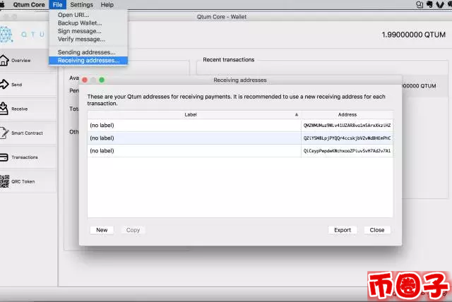 或者在File, Receiving addresses 里可以看到已有的收币地址: