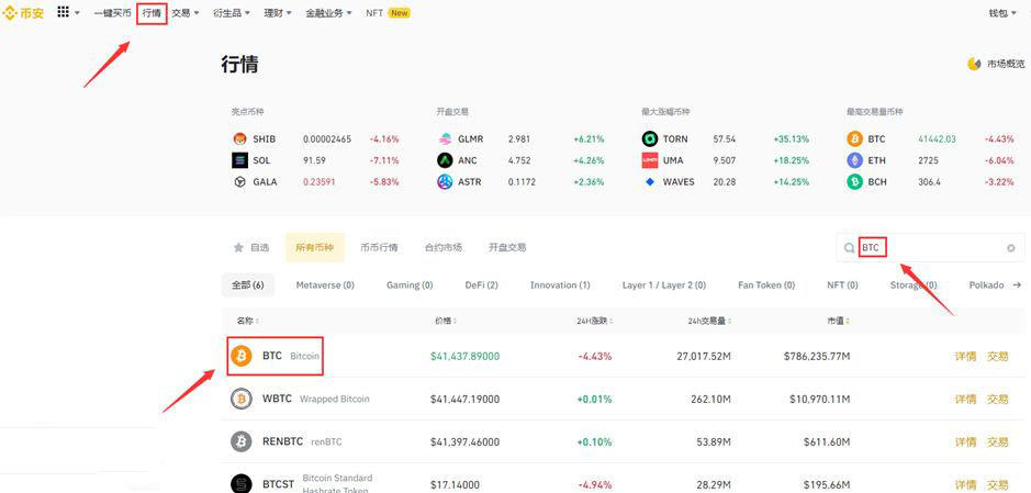 5、点击行情进入币种页面,搜索比特币英文简称BTC。