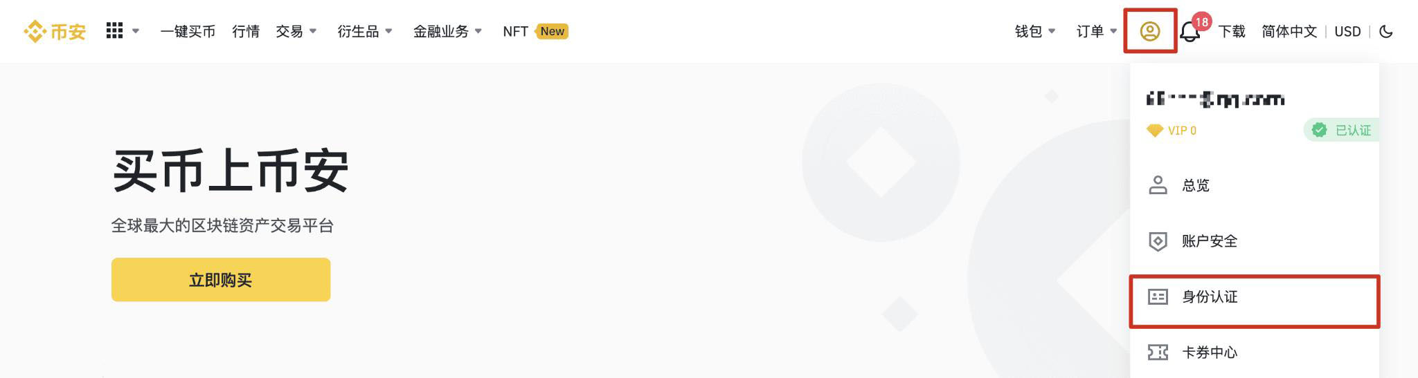 2、注册之后需要进行身份验证,您可以通过【用户中心】-【身份认证】进行身份认证,在该页面可以查看当前认证级别,它决定了您的账户在币安的交易限额。如需提升额度,请依次完成各个级别的身份认证。