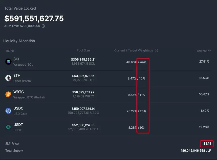 二是来自 5 种底层资产,理论上(下图中的 Target Welghtage),一枚 JLP 价格由 44% 的 SOL、 10% 的 ETH、 11% 的 WBTC、 26% 的 USDC 和 9% 的 USDT 组成。在官方平台页面上也会根据这些因素计算出 JLP 的净值,目前为 3.18 美元。