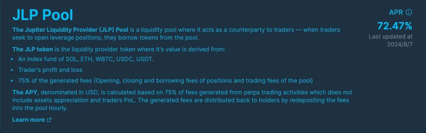 无论盈利还是亏损,开仓本金都来自 JLP 平台,因此,无论做多还是做空,从开仓那一刻起,交易者就在欠平台的债。据JLP Pool页面显示,目前 JLP 的 APR 为 72.47% ,但该数据每周更新一次,与实际收益有所差距。