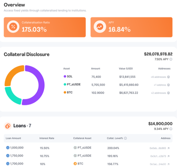 目前,Syrup上的USDC存款总额为4150万美元,这些资金被借给机构,这些机构已提供2600万美元的抵押品(包括SOL、PT-sUSDe和BTC),并借入1490万美元。USDC贷方的收益来自机构抵押品的收益率(7.5%年化收益率)和USDC借款利率(9.34%年化收益率)。