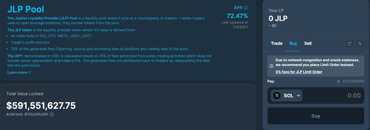 目前,可以直接在 JLP 官网通过 Jupiter 现价单购买 JLP,实现 0 手续费。购买的一部分 JLP 来自 LP 提供,一部分是新铸造的 JLP。当 JLP 达到 TVL 限制(7 亿美元)时将停止铸造,目前 TVL 达 5.91 亿美元。