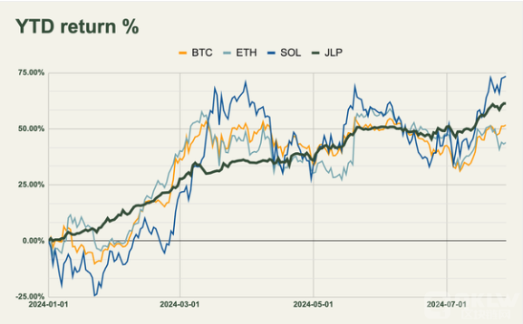 JLP尤其引人注目。尽管它不是稳定币,而是一种结构化产品,但其表现优于市场,同时波动性较小。如果SOL在今年剩余时间内继续强劲,而JLP保持高额费用,可能会继续强劲表现。