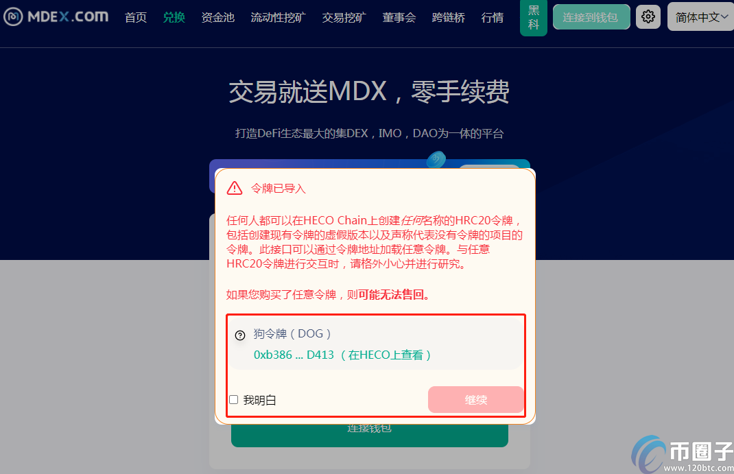2.勾选我明白,点击继续就可以购买小狗币