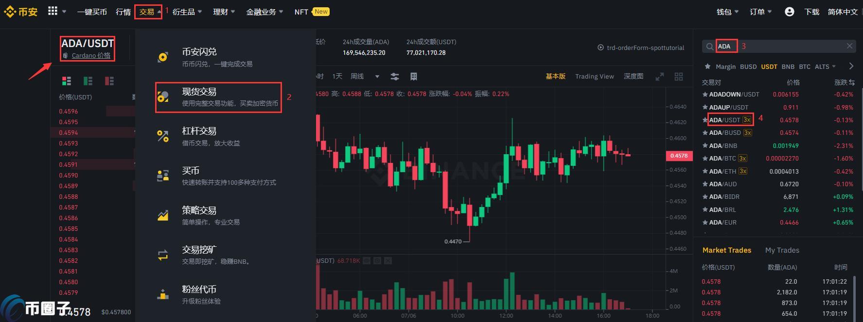 5、根据提示依次点击【交易】--【现货交易】,在右上角搜索框搜索币种简称ADA,选择【ADA/USDT】交易对。