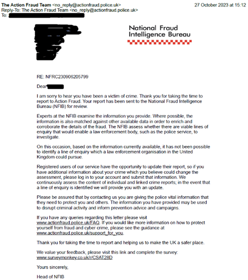 资金被盗的第二天,马丁通过伦敦市的诈骗举报工具提交了一份报告,以便将其转发给NFIB。然而,据他说,该机构在他提交报告将近一个月后才回复他的欺诈报告。当它最终回复时,它只是告诉他“未能确定英国执法机构可以追查的线索。”