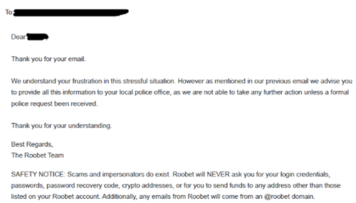 为了冻结这些资金并防止它们被提现,马丁只需要得到Roobet的合作。然而,当他联系Roobet时,他被告知除非收到当地执法机构的正式请求,否则无法冻结这些资金。